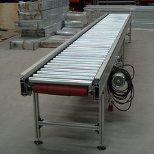 This type of conveyor is a powered conveyor where the product is carried on rollers. These carry rollers are powered by a endless belt centrally located underneath. Adjustable pressure rollers are located below the belt engaging the belt to the carry rollers providing the driving force. The rollers that make up the bed section can just be lifted out for ease of maintenance and worker safety.